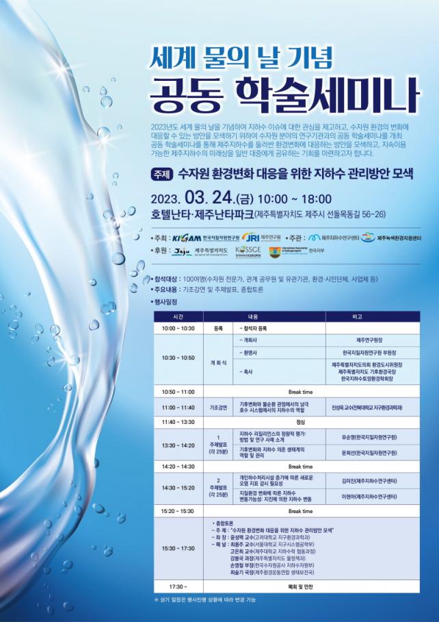ÀÌ¿Í °ü·ÃÇÏ¿© °øµ¿ Çмú¼¼¹Ì³ª¿¡¼´Â¡®¼öÀÚ¿ø ȯ°æº¯È ´ëÀÀÀ» À§ÇÑ ÁöÇϼö °ü¸®¹æ¾È ¸ð»ö¡¯À» ÁÖÁ¦·Î ±âÁ¶°¿¬°ú ÁÖÁ¦¹ßÇ¥, Åä·ÐÀÌ ÁøÇàµÈ´Ù. ÁöÇϼö¸¦ µÑ·¯½Ñ ȯ°æº¯È¿¡ ´ëÀÀÇÏ´Â ¹æ¾ÈÀ» ¸ð»öÇϰí, Áö¼ÓÀÌ¿ë °¡´ÉÇÑ Á¦ÁÖÁöÇϼöÀÇ ¹Ì·¡»óÀ» ÀÏ¹Ý ´ëÁß¿¡°Ô °øÀ¯ÇÏ´Â ±âȸ¸¦ ¸¶·ÃÇϰíÀÚ ÇÏ´Â ÃëÁö´Ù.