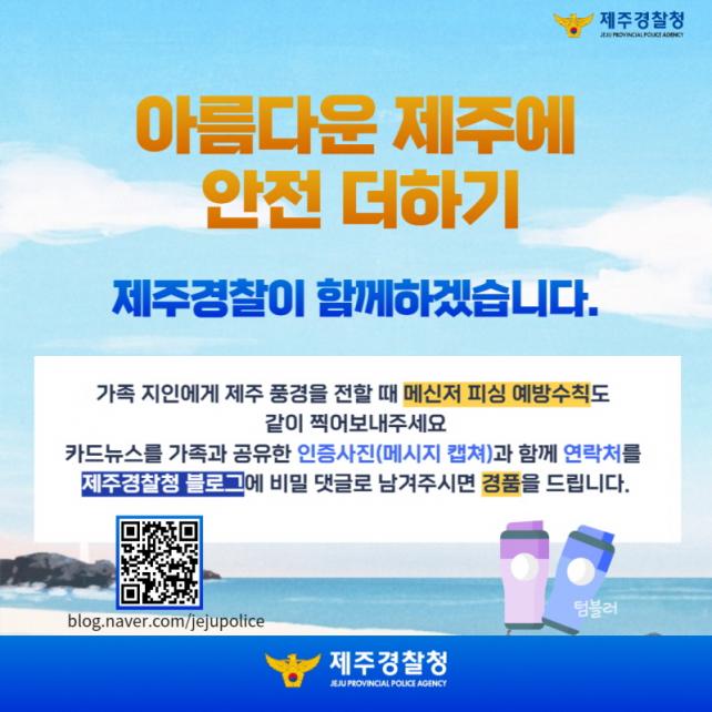 ¸ÕÀú, Á¦ÁÖ °ü±¤Çùȸ¿¡¼ À§ÃËÇÑ ¡®Á¦ÁÖ¿©Çà ¿µÇâ·ÂÀÚ(ÀÎÇ÷ç¾ð¼)¡¯¿Í Çù¾÷ÇÏ¿© ¿µÇâ·ÂÀÚÀÇ °³Àδ©¸®¼ÒÅë¸Á(SNS)¿¡ »çÀ̹ö¹üÁË ¿¹¹æ¼öÄ¢ Ä«µå´º½º¸¦ °Ô½ÃÇϰí, °¡Á·‧ÁöÀΰú ¿¹¹æ¼öÄ¢À» °øÀ¯ÇÏ´Â ´©¸®²Û¿¡°Ô´Â Ãß÷À» ÅëÇØ ÅÒºí·¯¸¦ ÁõÁ¤ÇÏ´Â ¼Ò¹®³»±â Çà»ç¸¦ ÁøÇàÇϰí ÀÖ´Ù. 3¿ù 31ÀÏ(±Ý) ¿ÀÀü¿¡´Â Á¦ÁÖ±¹Á¦°øÇ× 1Ãþ µµÂøÀå¿¡¼ »çÀ̹ö ¸í¿¹°æÂû ´©¸®Ä°½º¿Í ÇÔ²² Á¦ÁÖ¿¡ ÀÔµµÇÏ´Â µµ¹Î ¹× °ü±¤°´µéÀ» ´ë»óÀ¸·Î »çÀ̹ö¹üÁË ¿¹¹æ¼öÄ¢ÀÌ ´ã±ä È«º¸¹°°ú ±â³äǰÀ» ³ª´²ÁÖ´Â Ä·ÆäÀÎÀ» Àü°³ÇÒ ¿¹Á¤ÀÌ´Ù.