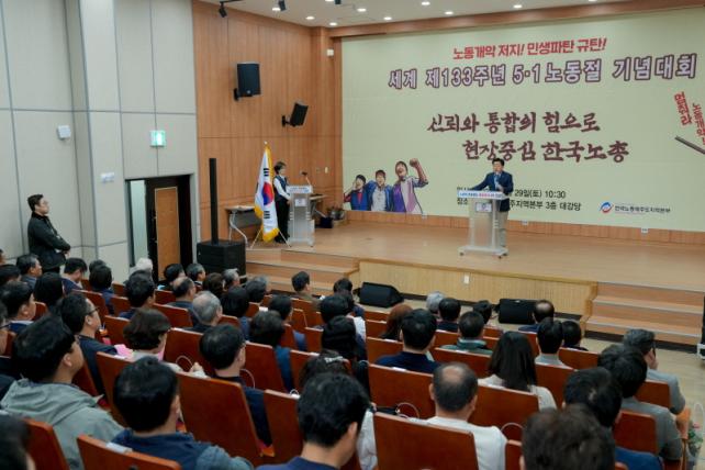 [Á¦ÁÖµµ¹Î½Å¹® = ¿ÀÁØÇõ ±âÀÚ] ¿¾ÇÇÑ ³ëµ¿Á¶°Ç °³¼±°ú ÁöÀ§ Çâ»ó¿¡ Çå½ÅÇÑ ³ëµ¿ÀÚµéÀ» ±â¸®´Â ¡®Á¦133ÁÖ³â 5¡¤1 ¼¼°è³ëµ¿Àý ±â³ä½Ä¡¯ÀÌ 29ÀÏ ¿ÀÀü 10½Ã 30ºÐ ±Ù·ÎÀÚÁ¾ÇÕº¹Áö°ü ´ë°´ç¿¡¼ °³ÃֵƴÙ.
