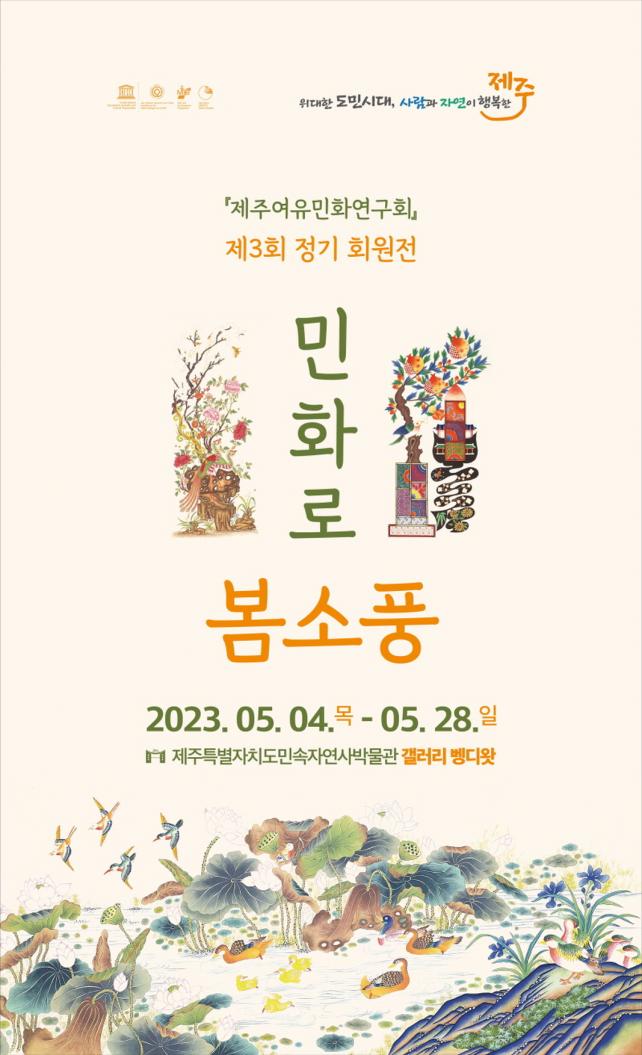 [Á¦ÁÖµµ¹Î½Å¹® = ¿À½ÂÅà ±âÀÚ] Á¦ÁÖÆ¯º°ÀÚÄ¡µµ ¹Î¼ÓÀÚ¿¬»ç¹Ú¹°°ü(°üÀå ¹ÚÂù½Ä)Àº ¡º¹ÎÈ­·Î º½¼Òdz¡»Á¤±â ȸ¿øÀüÀ» °¶·¯¸® º¬µð¿Ó¿¡¼­ 4~28ÀÏ °³ÃÖÇÑ´Ù.   À̹ø Àü½Ã´Â ¡ºÁ¦ÁÖ¿©À¯¹ÎÈ­¿¬±¸È¸(ȸÀå ¹®¼Ò¹Ì)¡»°¡ ¸¶·ÃÇÑ Á¦3ȸ Á¤±â ȸ¿øÀüÀ¸·Î, ¹®¼Ò¹Ì, ¹éÃæÀÇ, ±è¹Ì°æ, ±èÀºÁÖ, ±èÇØ¿ï, ³ë¼±¿©, ¹ÎÈ­¼ø, ¹ÚäÈñ, ¹é°æ¹Ì, ¿ÀÀ¯Á¤, À¯ÇöÁÖ, ¿©¾Æ¶÷, Àå°æÈñ, Àå¸íÈñ µî 14¸íÀÇ ÀÛ°¡°¡ Âü¿©ÇÑ´Ù.   Àü½Ã ÀÛǰÀº ¹®ÀÚµµ(Àå¸íÈñ), ºÀȲ¸ð¶õµµ(À¯ÇöÁÖ), ¿¬Áöµµ(Àå°æÈñ), Ã¥°¡µµ(¹®¼Ò¹Ì), ÆÄÃʵµ(±èÀºÁÖ) µî 20¿© Á¡ÀÌ´Ù. Á¤±â ȸ¿øÀüÀ» ÃѰý ±âȹÇÑ ¹®¼Ò¹Ì ȸÀåÀº ¡°¹ÎÈ­´Â ¼Ò¼ÒÇÑ ÀÏ»óÀ» ¿¹¼ú·Î ½ÂÈ­½ÃŰ´Â °¡Àå Çѱ¹ÀûÀÎ ¹®È­¿¹¼ú¡±À̶ó¸ç ¡°À̹ø Àü½Ãȸ¸¦ ÅëÇØ ³²±¹¿¡¼­ ¸ÂÀº º½ÀÇ Á¤Ã븦 ¸¸³£Çϸ鼭 ¼¶ÀÇ Ç³±¤°ú ÀÏ»óÀûÀÎ »îÀ» µû¶æÇÏ°Ô °¨»óÇÏ½Ã±æ ¹Ù¶õ´Ù¡±°í ¸»Çß´Ù.   ¹ÚÂù½Ä °üÀåÀº ¡°¹ÎÃʵéÀÇ »îÀº ÀηùÀÇ °¡Àå º¸ÆíÀû °¡Ä¡ÀÌÀÚ Àü½ÂµÅ¾ß ÇÒ ¾Æ¸§´Ù¿î À¯»ê¡±À̶ó¸é¼­ ¡°Á¦ÁÖ»ç¶÷µéÀÌ ÀÚ¿¬°ú ÇÔ²² »ì¾Æ¿Â ÁöÇý°¡ ³ì¾Æ ÀÖ´Â ¹ÎÈ­¸¦ ÅëÇØ ÁøÁ¤ÇÑ »îÀÇ ÀÌÁ¤Ç¥¸¦ µé¿©´Ùº¸±æ Èñ¸ÁÇÑ´Ù¡±°í ¸»Çß´Ù.   ÇÑÆí, 2021³â¿¡ ⸳ÇÑ ¡ºÁ¦ÁÖ¿©À¯¹ÎÈ­¿¬±¸È¸¡»¿¡´Â 40¿©¸íÀÌ È°µ¿ ÁßÀ̸ç, ¹®¼Ò¹Ì ȸÀåÀº Çѱ¹¹ÎÈ­Çùȸ ¹× ¼­¿¹¹®ÀÎȸ Ãßõ ÀÛ°¡, ¹¬¿¬Çѱ¹ÀüÅë¹Ì¼úÇùȸ Á¦ÁÖÁöºÎÀå µîÀ¸·Î Ȱµ¿Çϰí ÀÖ´Ù.