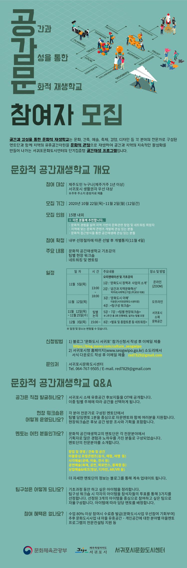 º» »ç¾÷Àº ¼±ÍÆ÷½Ã ¹®Èµµ½Ã Á¶¼º»ç¾÷ÀÇ ÀÏȯÀ¸·Î Áö¿ªÀÇ À¯ÈÞ°ø°£ÀÚ¿øÀ» ¹®ÈÀû °üÁ¡À¸·Î Àç»ýÇÏ¿© °ø°£°ú Áö¿ªÀÇ Áö¼ÓÀûÀΠȰ¼ºÈ ½Çõ¹æ¹ýÀ» ¹è¿ì´Â ´Ü±âÁýÁßÇü ÇÁ·Î±×·¥ÀÌ´Ù. °ÀÇ ±¸¼ºÀº ¿Â¶óÀÎ ±âÃʰÀÇ¿Í ÆÀº° ±¸¼º¿¡ µû¸¥ ÇöÀå¿öÅ©¼óÀ¸·Î ÁøÇàµÈ´Ù. ¸ðÁý´ë»óÀº Á¦ÁÖ°ÅÁÖ 1³â ÀÌ»ó Á¦ÁÖµµ¹Î ´©±¸³ª Á¢¼ö °¡´ÉÇϰí(¼±ÍÆ÷½Ã °ÅÁÖ ¹× »ýȰ±ÇÀÚ ¿ì¼± ´ë»ó), ¸ðÁýÀοø Ãʰú½Ã Âü°¡½Åû¼ µî¿¡ µû¶ó ¼±Á¤½É»ç¸¦ ÁøÇàÇÑ´Ù. ½Åû¹æ¹ýÀº ¼±ÍÆ÷½Ãû ¹× ¹®Èµµ½Ã¼±ÍÆ÷ ºí·Î±×¸¦ ÅëÇØ Âü°¡½Åû¼¸¦ ÀÛ¼ºÇÏ¿© À̸ÞÀÏ(red7829@gmail.com)Á¢¼ö ¹× ¹æ¹®Á¢¼ö(¼±ÍÆ÷½Ã¹®Èµµ½Ã¼¾ÅÍ) ÇÏ¸é µÈ´Ù.