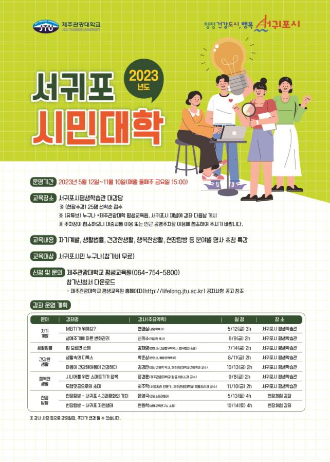 ¼±ÍÆ÷½Ã¿Í Á¦ÁÖ°ü±¤´ëÇб³°¡ ¿î¿µÇÏ´Â ¡®2023³â ¼±ÍÆ÷½Ã¹Î´ëÇС¯Àº ¼±ÍÆ÷½Ã¹ÎÀ» ´ë»óÀ¸·Î 5¿ùºÎÅÍ 11¿ù±îÁö ¸Å¿ù 1ȸ (¸Å¿ù µÑ° ÁÖ ±Ý¿äÀÏ)½Ç½ÃµÇ¸ç, ÀÚ±â°è¹ß․µðÁöÅÐ․°Ç°ºÐ¾ß µî ½Ã¹Î¿ª·® °È ¹× º¯ÈÇÏ´Â »çȸ¿Í ¼ÒÅëÀ» À§ÇÑ ´Ù¾çÇÑ ºÐ¾ßÀÇ °Á¸¦ Á¦°øÇÒ ¿¹Á¤ÀÌ´Ù.