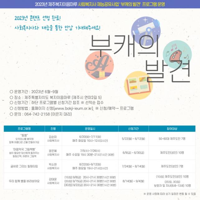 ÇÁ·Î±×·¥Àº 6¿ù~9¿ùµ¿¾È ¿î¿µµÇ¸ç ´ë»óÀº µµ³» ¼ºÀÎ »Ó¸¸ ¾Æ´Ï¶ó 50~60´ë ÁßÀå³â, º¸È£ÀÚ ¹× ÀÚ³à µîÀ¸·Î Âü¿© ±âȸ¸¦ ³ÐÇû´Ù. ½ÅûÀº Á¦ÁÖº¹ÁöÀÌÀ½¸¶·ç ȨÆäÀÌÁö(www.bokji-ieum.or.kr)¸¦ ÅëÇØ ¼±Âø¼ø Á¢¼öÀ̸ç, ºñ¿ëÀº ¹«·áÀÌ´Ù.Âü¿©ÀÚ ¸ðÁý ¹× ÇÁ·Î±×·¥ ¿î¿µ¿¡ ´ëÇÑ Á¤º¸´Â Á¦ÁÖº¹ÁöÀÌÀ½¸¶·ç ȨÆäÀÌÁö, SNS(ÀνºÅ¸±×·¥ @bokji_ieum)¿¡¼ È®ÀÎ °¡´ÉÇÏ¸ç ¹®ÀÇ´Â Á¦ÁÖº¹ÁöÀÌÀ½¸¶·ç(064-742-2158~60)·Î ÇÏ¸é µÈ´Ù.