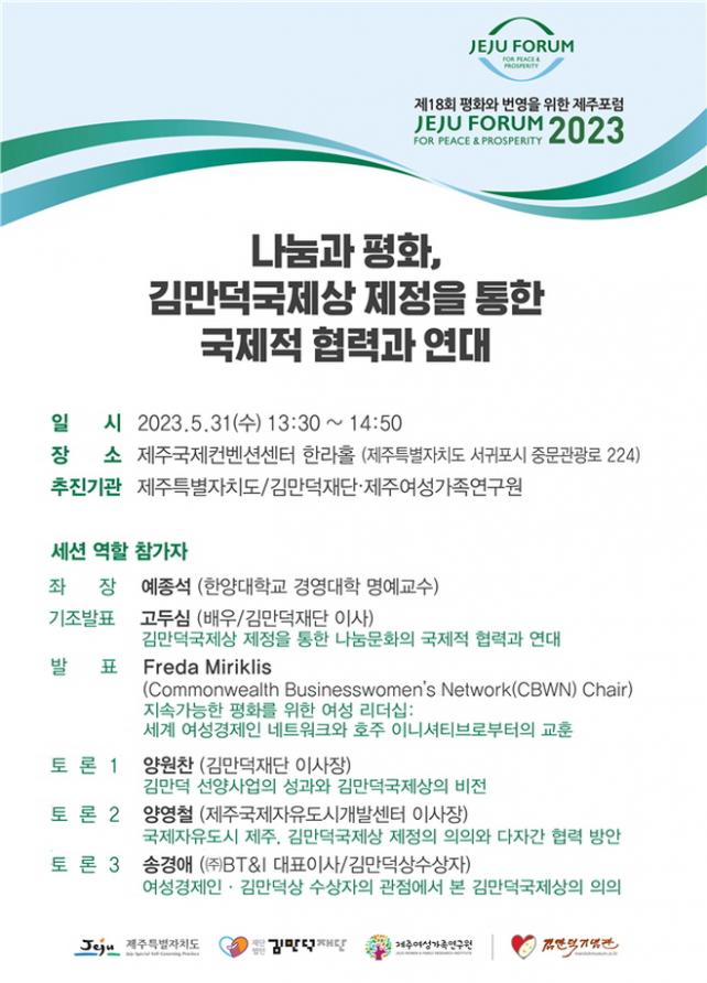 Á¦ÁÖÆ¯º°ÀÚÄ¡µµ¿Í ±è¸¸´öÀç´Ü(ÀÌ»çÀå ¾ç¿øÂù), Á¦ÁÖ¿©¼º°¡Á·¿¬±¸¿ø(¿øÀå ¹®¼ø´ö)ÀÌ ÁÖÃÖÇÏ´Â À̹ø ¼¼¼ÇÀº ¡®³ª´®°ú ÆòÈ, ±è¸¸´ö±¹Á¦»ó Á¦Á¤À» ÅëÇÑ ±¹Á¦Àû Çù·Â°ú ¿¬´ë¡¯¶ó´Â ÁÖÁ¦·Î 5¿ù 31ÀÏ ¿ÀÈÄ 1½Ã 30ºÐ Á¦ÁÖ±¹Á¦ÄÁº¥¼Ç¼¾ÅÍ ÇѶóȦ¿¡¼ ¿¸°´Ù.