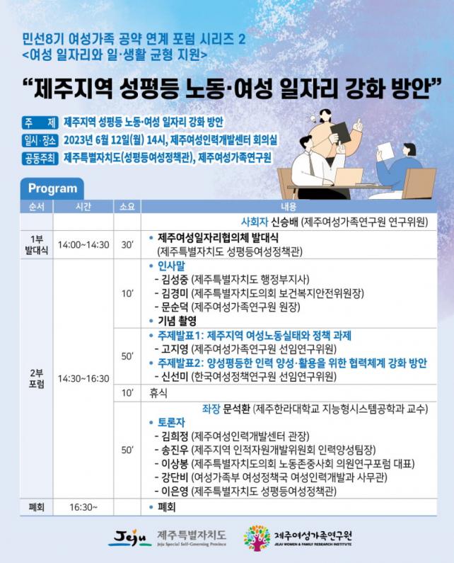 ±è¼ºÁß Á¦ÁÖÆ¯º°ÀÚÄ¡µµ ÇàÁ¤ºÎÁö»ç, ±è°æ¹Ì Á¦ÁÖÆ¯º°ÀÚÄ¡µµÀÇȸ º¸°Çº¹Áö¾ÈÀüÀ§¿øÀå µîÀÌ Âü¼®ÇÏ´Â À̹ø Æ÷·³¿¡¼´Â, Á¦ÁÖ¿©¼ºÀÏÀÚ¸®ÇùÀÇü ¹ß´ë½Ä°ú ´õºÒ¾î Á¦ÁÖÁö¿ª ¿©¼º ³ëµ¿½ÇÅ¿¡ ´ëÇÑ Áø´Ü°ú ÀÏÀÚ¸® Á¤Ã¥ °È ¹æ¾È ¸ð»öÀ» À§ÇÑ ³íÀǰ¡ ÀÌ·ç¾îÁú ¿¹Á¤ÀÌ´Ù.
