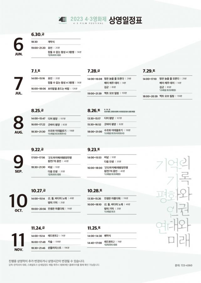 <2023 4¡¤3¿µÈÁ¦>´Â ¡®±â¾ïÀÇ ±â·Ï, ÆòÈ¿Í ÀαÇ, ¿¬´ë¿Í ¹Ì·¡¡¯ ¼¼ °¡Áö ÁÖÁ¦·Î ÃÑ 19ÆíÀÇ ÀÛǰÀ» »ó¿µÇÑ´Ù. 4¡¤3À» ´Ù·é ´ÙÅ¥¸àÅ͸®¸¦ ºñ·ÔÇØ ±¹°¡Æø·ÂÀ» °í¹ßÇϰí, ÀúÇ×°ú ÆòÈ Á¤½ÅÀ» ´ãÀº ±¹³»¡¤¿Ü ÀÛǰµµ ¾ö¼±Çß´Ù.