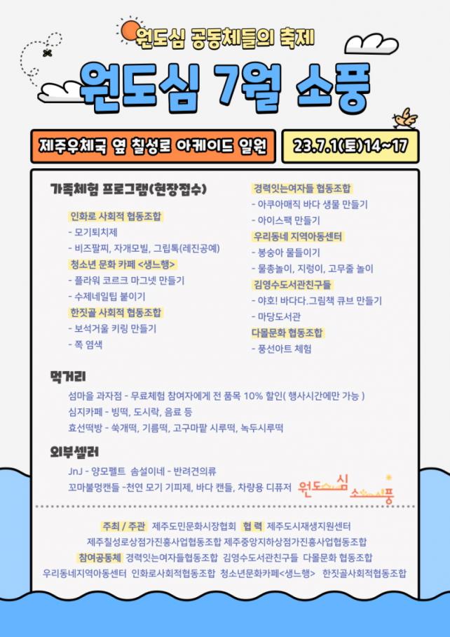 Á¦ÁÖµµ¹Î¹®È½ÃÀåÇùȸ°¡ ÁÖÃÖÇϰí Á¦ÁÖ ¿øµµ½É ¹®È°øµ¿Ã¼°¡ Á÷Á¢ ¿î¿µÇϸç Á¦ÁÖµµ½ÃÀç»ýÁö¿ø¼¾ÅͰ¡ Áö¿øÇÏ¿© ÁøÇàÇÒ ¡®Á¦ÁÖ ¿øµµ½É ¼Òdz¡¯Àº 7¿ù 1ÀÏ Åä¿äÀÏ ¿ÀÈÄ 2½ÃºÎÅÍ 5½Ã±îÁö Ä¥¼º·Î ¾ÆÄÉÀ̵å ÀÏ¿ø¿¡¼ ÁøÇàµÉ ¿¹Á¤ÀÌ´Ù.