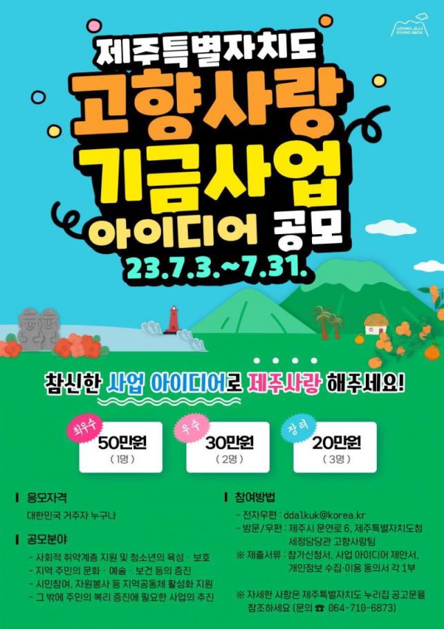 Á¦ÁÖµµ´Â ¿À´Â 7¿ù 3ÀϺÎÅÍ 31ÀϱîÁö ¡®Á¦ÁÖÆ¯º°ÀÚÄ¡µµ °íÇâ»ç¶û ±â±Ý»ç¾÷ ¾ÆÀ̵ð¾î °ø¸ð¡¯¸¦ ½Ç½ÃÇÑ´Ù.