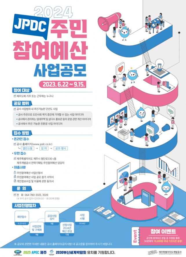 À̹ø °ø¸ð´Â Á¦ÁÖ¿¡ °ÅÁÖ ¶Ç´Â ±Ù¹«ÇÏ´Â ´©±¸³ª Âü¿©ÇÒ ¼ö ÀÖÀ¸¸ç, °ø¸ð»ç¾÷ Á¢¼ö´Â Á¦ÁÖ°³¹ß°ø»ç ȨÆäÀÌÁö(www.jpdc.co.kr) ¿¡¼ ¿Â¶óÀÎ ¶Ç´Â ¿ìÆíÀ¸·Îµµ °¡´ÉÇÏ´Ù. À̹ø °ø¸ð Âü¿©ÀÚ Áß Ãß÷À» ÅëÇØ 30¸í¿¡°Ô 1¸¸ ¿ø À̳» ±âÇÁƼÄÜÀ» ÁõÁ¤ÇÏ´Â À̺¥Æ®µµ ÁøÇàµÈ´Ù.