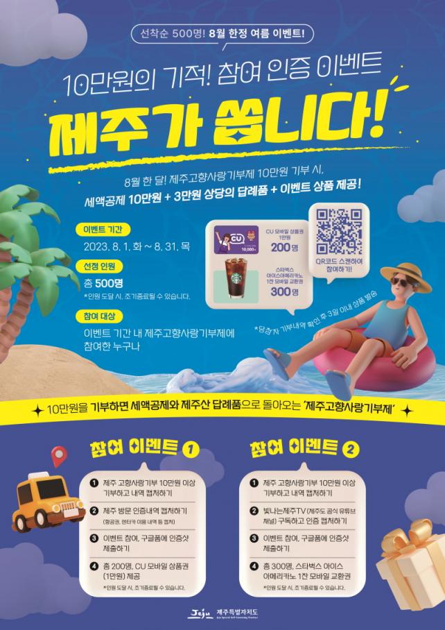 À̺¥Æ® ±â°£¿¡ 10¸¸ ¿ø ÀÌ»ó Á¦ÁÖ¿¡ °íÇâ»ç¶û±âºÎ¸¦ Çϰí, Á¦ÁÖ ¹æ¹® ÀÎÁõ »çÁø(Ç×°ø±Ç, ·»ÅÍÄ« À̿볻¿ª µî)À» ±¸±ÛÆûÀ¸·Î Á¦ÃâÇÏ¸é ¼±Âø¼ø 200¸í¿¡°Ô 1¸¸¿øÀÇ ¸ð¹ÙÀÏ »óǰ±ÇÀÌ Áö±ÞµÈ´Ù. ¶ÇÇÑ À̺¥Æ® ±â°£¿¡ 10¸¸ ¿ø ÀÌ»ó Á¦ÁÖ¿¡ °íÇâ»ç¶û±âºÎ¸¦ Çϰí, Á¦ÁÖµµ °ø½Ä À¯Æ©ºê(ºû³ª´Â Á¦ÁÖTV) ±¸µ¶ ÀÎÁõ »çÁøÀ» ±¸±ÛÆûÀ¸·Î Á¦ÃâÇÏ¸é ¼±Âø¼ø 300¸í¿¡°Ô ¸ð¹ÙÀÏ Ä¿ÇÇ ÄíÆùÀÌ Áö±ÞµÉ ¿¹Á¤ÀÌ´Ù.