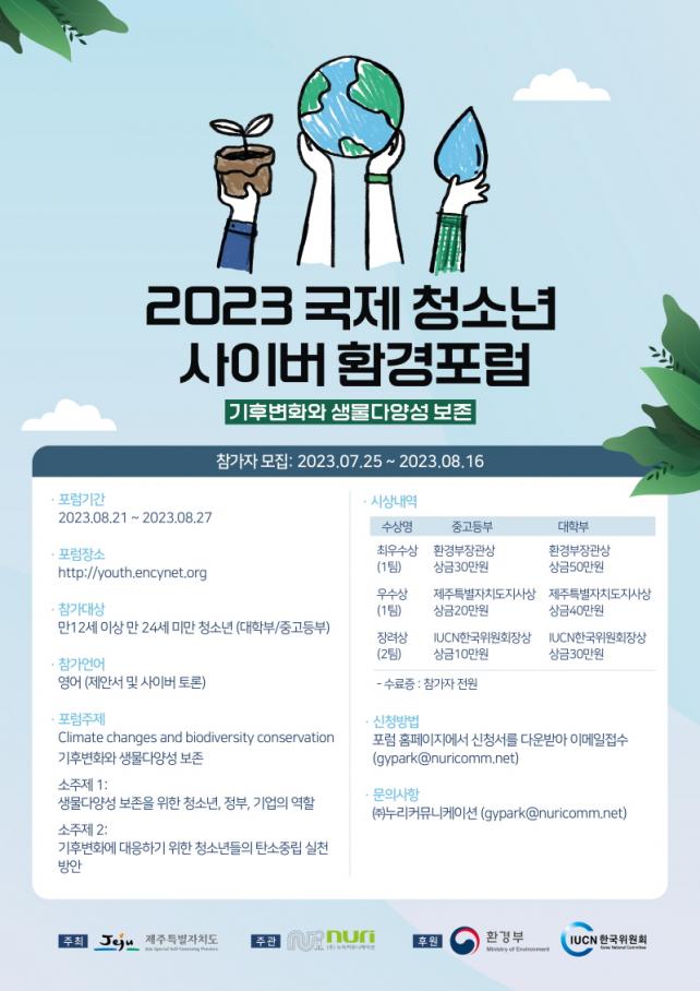 Á¦ÁÖµµ°¡ ÁÖÃÖÇϰí ȯ°æºÎ¿Í ¼¼°èÀÚ¿¬º¸Àü¿¬¸Í(IUCN) Çѱ¹À§¿øÈ¸°¡ ÈÄ¿øÇÏ´Â À̹ø Æ÷·³Àº ¡®±âÈĺ¯È¿Í »ý¹°´Ù¾ç¼º º¸Á¸(Climate changes and biodiversity conservation)¡¯À» ÁÖÁ¦·Î ±¹Á¦Ã»¼Ò³â »çÀ̹öȯ°æÆ÷·³ À¥»çÀÌÆ®(http://youth.encynet.org)¿¡¼ ÁøÇàµÈ´Ù.