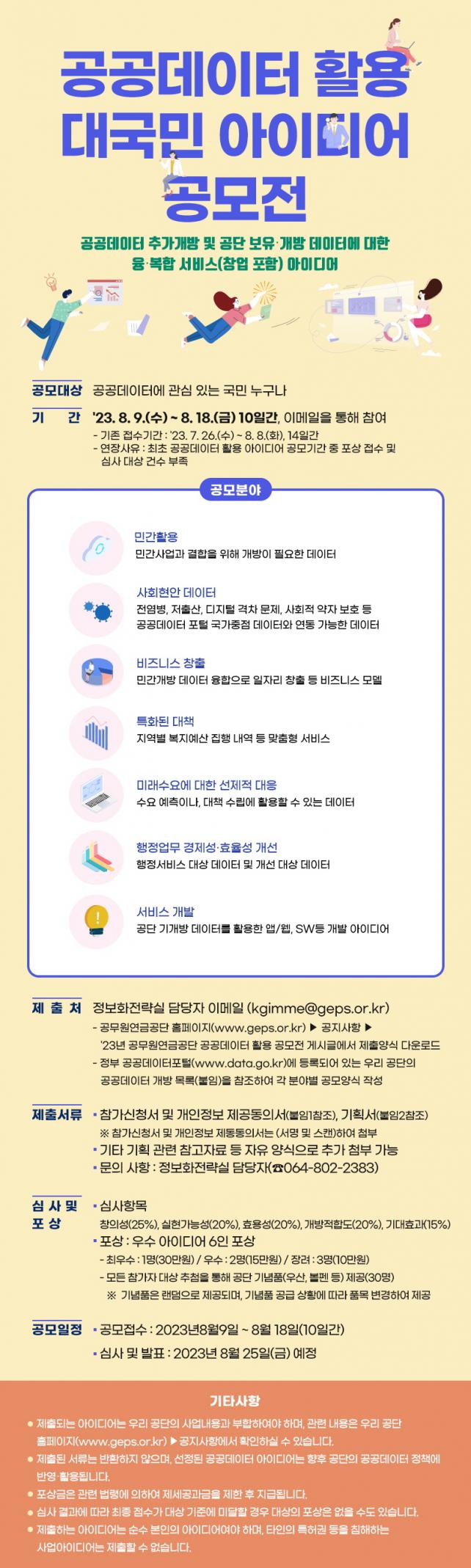 ±¹¹Î ´©±¸³ª Âü¿©ÇÒ ¼ö ÀÖ´Â À̹ø °ø¸ð´Â °ø¹«¿ø¿¬±Ý°ø´Ü ȨÆäÀÌÁö(www.geps.or.kr > ¾Ë¸²°ú ¼ÒÅë > °øÁö»çÇ×) ¡®°ø°øµ¥ÀÌÅÍ È°¿ë ´ë±¹¹Î ¾ÆÀ̵ð¾î °ø¸ðÀü¡¯ °Ô½Ã¹°¿¡¼ Âü°¡½Åû¼ ¹× ±âȹ¼¸¦ ÀÛ¼º ÈÄ À̸ÞÀÏ(kgimme@geps.or.kr)·Î 18ÀϱîÁö Á¢¼öÇÏ¸é µÈ´Ù.