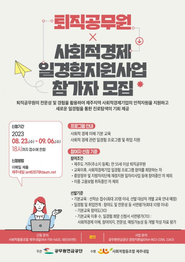 À̹ø Çù¾àÀ» ÅëÇØ °ø¹«¿ø¿¬±Ý°ø´ÜÀº Á¦ÁÖÁö¿ª ÅðÁ÷°ø¹«¿øÀÇ °øÁ÷ Àü¹®¼º°ú °æÇèÀ» Ȱ¿ëÇÏ¿© »çȸÀû°æÁ¦ ±â¾÷¿¡ ÀÎÀûÀÚ¿øÀ» Áö¿øÇϰí, Á¦ÁÖ»çȸÀû°æÁ¦Áö¿ø¼¾ÅÍ´Â Áö¿ª¹®Á¦ ¹ß±¼ ¹× ÇØ°áÀ» À§ÇÑ ¿ª·®°È ±³À°, Çùµ¿Á¶ÇÕÁ¦ÁÖ³»ÀÏÀº »çȸÀû°æÁ¦ ÀÏ-°æÇè ¿¬°è ¹× Ãë¾÷¾Ë¼± ÇÁ·Î±×·¥ µîÀ» ´ã´çÇÒ ¿¹Á¤ÀÌ´Ù.