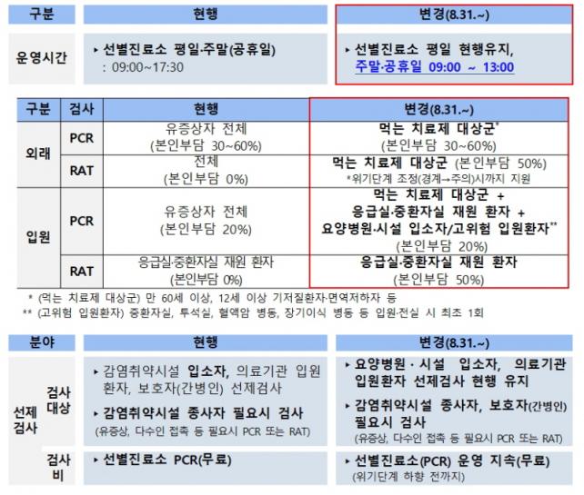 º¸°Ç¼Ò ¼±º°Áø·á¼ÒÀÇ ÆòÀÏ ¿î¿µ½Ã°£Àº ÇöÇà´ë·Î ¿ÀÀü 9½ÃºÎÅÍ ¿ÀÈÄ 5½Ã 30ºÐ±îÁö À¯ÁöÇϰí, ÁÖ¸»°ú °øÈÞÀÏ ¿î¿µ½Ã°£Àº ¿ÀÀü 9½ÃºÎÅÍ ¿ÀÈÄ 1½Ã±îÁö·Î Á¶Á¤ÇÑ´Ù. 2020³â 1¿ù 31ÀÏ ¼±º°Áø·á¼Ò ¿î¿µ ÀÌÈÄ 3³â 7°³¿ù ¸¸¿¡ Á¶Á¤µÇ´Â Á¶Ä¡·Î, °¨¿°º´ µî±ÞÀº ÇÏÇâµÆÁö¸¸ ¡ã¿ä¾çº´¿ø¡¤½Ã¼³ ÀÔ¼ÒÀÚ, ÀÇ·á±â°ü ÀÔ¿øÈ¯ÀÚ ¼±Á¦°Ë»ç´Â ÇöÇà À¯ÁöµÊ¿¡ µû¶ó ¡ã°¨¿°Ãë¾à½Ã¼³ Á¾»çÀÚ, º¸È£ÀÚ(°£º´ÀÎ)¿¡ ´ëÇØ ÇÊ¿ä ½Ã °Ë»ç¸¦ Áö¿øÇÑ´Ù.