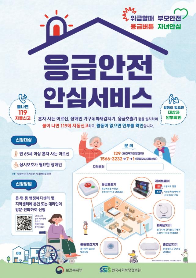 ÀÌ ¼ºñ½º´Â ´ë»óÀÚ °¡Á¤¿¡ ÀÀ±ÞÈ£Ãâ±â, Ȱµ¿¡¤ÈÀ硤ÃâÀÔ¹® °¨Áö±â µîÀÇ Àåºñ¸¦ ¼³Ä¡ÇÏ¿© ÀÀ±Þ»óȲ ¹ß»ý ½Ã ÀÀ±ÞÈ£Ãâ ¹öưÀ» ´©¸£¸é ¼Ò¹æ¼(119)¿¡ ÀÚµ¿ ½Å°íµÇ°í, ÀÀ±Þ°ü¸®¿ä¿øÀÌ »ó½Ã¸ð´ÏÅ͸µÀ¸·Î 365ÀÏ ´ë»óÀÚÀÇ ¾ÈÀüÀ» Áö۰í ÀÖ´Ù.