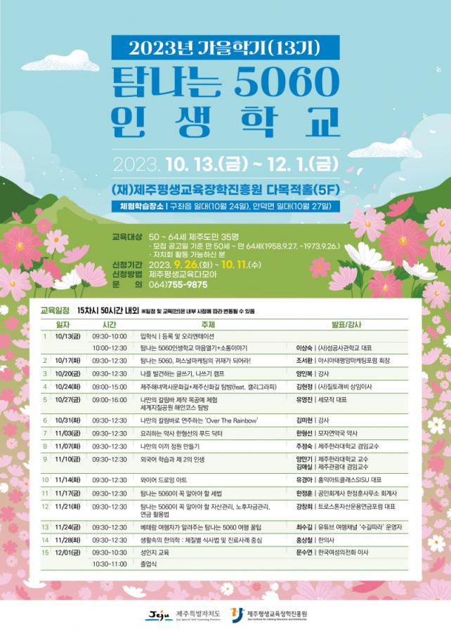 ¡®2023³â ޳ª´Â 5060ÀλýÇб³ °¡À»Çбâ(13±â)¡¯´Â Àλý Àüȯ±â¸¦ ¸ÂÀÌÇÏ´Â Àå³âÃþ¿¡°Ô Àλý ÈĹݱâÀÇ »îÀ» ¼³°èÇÒ ¼ö ÀÖµµ·Ï Áö¿øÇÏ´Â Àλý Àç¼³°è °úÁ¤ÀÌ´Ù. 10¿ù 13ÀϺÎÅÍ 12¿ù 1ÀϱîÁö ¸ÅÁÖ È¡¤±Ý¿äÀÏ(9½Ã 30ºÐ~12½Ã 30ºÐ) Á¦ÁÖÆò»ý±³À°ÀåÇÐÁøÈï¿ø¿¡¼ ÁøÇàµÈ´Ù. Âü°¡ºñ´Â ¹«·á´Ù.