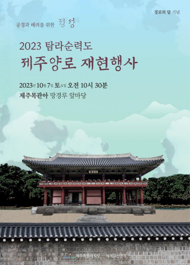 1432³â(¼¼Á¾ 14)¿¡ ½ÃÀÛµÈ Á¦ÁÖ¾ç·Î´Â °¢ Áö¹æ ¼ö·ÉµéÀÌ ¿ÕÀ» ´ëÇàÇØ ³ëÀÎÀ» ´ëÁ¢ÇÏ´ø ¿¬È¸·Î, 1702³â 11¿ù 19ÀÏ¿¡ Á¦ÁÖ¸ñ»ç ÀÌÇü»óÀÌ ¸Á°æ·ç ¾Õ¿¡¼ Á¦ÁÖ¸ñ¿¡ °ÅÁÖÇÏ´ø ³ëÀÎ µéÀ» ¸ð½Ã°í ¾ç·Î¿¬À» ½ÃÇàÇÑ ¸ð½ÀÀÌ Å½¶ó¼ø·Âµµ¿¡ ¹¦»çµÇ¾î ÀÖ´Ù. À̹ø Çà»ç´Â 10¿ù 7ÀÏ(Åä) ¿ÀÀü 10½Ã 30ºÐºÎÅÍ Á¦ÁÖ¸ñ °ü¾Æ ¸Á°æ·ç ¾Õ¸¶´ç¿¡¼ ÁøÇàµÇ¸ç µµ³» ¾î¸£½Å 120ºÐÀ» ¸ð¼Å ¾Æ¸§´Ù¿î ±ÃÁßÀ½¾Ç°ú Ãã °ø¿¬À» ÆîÄ¥ ¿¹Á¤ÀÌ´Ù.
