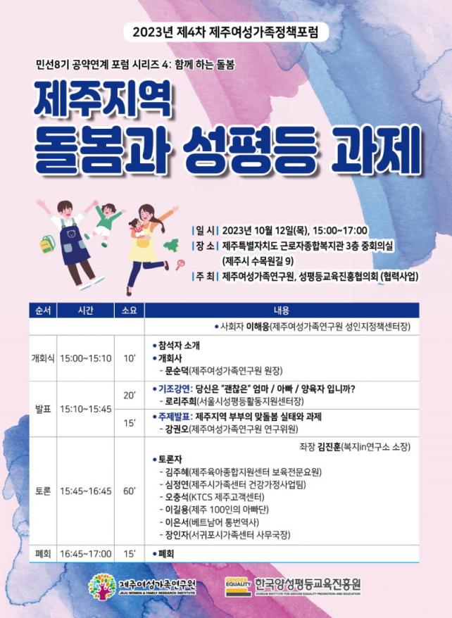 ±âÁ¶°¿¬Àº ¡°´ç½ÅÀº ±¦ÂúÀº ¾ö¸¶/¾Æºü/¾çÀ°ÀÚÀԴϱî?¡±¶ó´Â ÁÖÁ¦·Î ¼¿ï½Ã ¼ºÆòµîȰµ¿Áö¿ø¼¾ÅÍ ·Î¸®ÁÖÈñ ¼¾ÅÍÀåÀÌ ¸Ã¾ÒÀ¸¸ç, µÚÀÌ¾î ¡°Á¦ÁÖÁö¿ª ºÎºÎÀÇ ¸Âµ¹º½ ½ÇÅÂ¿Í °úÁ¦¡±¶ó´Â ÁÖÁ¦·Î Á¦ÁÖ¿©¼º°¡Á·¿¬±¸¿ø °±Ç¿À ¿¬±¸À§¿øÀÌ ÁÖÁ¦¹ßÇ¥¸¦ ÁøÇàÇÑ´Ù.