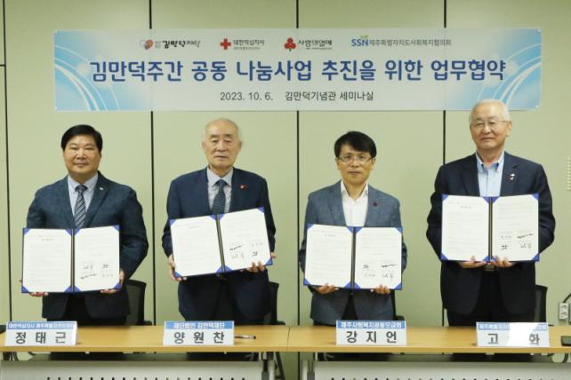 10¿ù 6ÀÏ ¿ÀÈÄ4½Ã, ±è¸¸´ö±â³ä°ü¿¡¼ ¿¸° Çù¾à½Ä¿¡´Â ±è¸¸´öÀç´Ü ¾ç¿øÂùÀÌ»çÀå°ú ´ëÇÑÀû½ÊÀÚ»çÁ¦ÁÖÆ¯º°ÀÚÄ¡µµÁö»ç Á¤Å±ÙȸÀå, Á¦ÁÖ»çȸº¹Áö°øµ¿¸ð±Ýȸ °Áö¾ðȸÀå, Á¦ÁÖÆ¯º°ÀÚÄ¡µµ»çȸº¹ÁöÇùÀÌȸ °í½ÂÈȸÀåÀ» ºñ·ÔÇØ °¢ ±â°ü °ü°èÀÚµéÀÌ Âü¼®Çß´Ù.