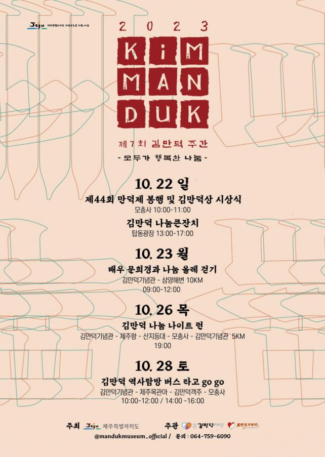 ÀÚ¼¼ÇÑ »çÇ×Àº ±è¸¸´ö±â³ä°ü ȨÆäÀÌÁö www.mandukmuseum.or.kr ¶Ç´Â ±è¸¸´ö±â³ä°ü SNSä³Î(ÆäÀ̽ººÏ, ÀνºÅ¸±×·¥)¿¡¼ È®ÀÎÇÒ ¼ö ÀÖÀ¸¸ç, Àüȹ®ÀÇ´Â 064-759-6090(±è¸¸´ö±â³ä°ü)ÀÌ´Ù.