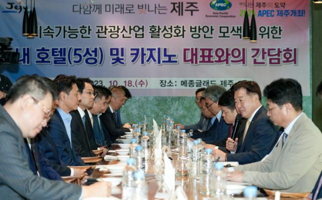¿À¿µÈÆ Áö»ç´Â 18ÀÏ ³· 12½Ã ¸ÞÁ¾±Û·¡µå Á¦ÁÖÈ£ÅÚ¿¡¼ µµ³» 5¼º±Þ È£ÅÚ ¹× Ä«Áö³ë¾÷ ´ëÇ¥µéÀ» ¸¸³ª Á¦ÁÖ °ü±¤»ê¾÷ÀÇ ¼ºÀå ¹× È°¼ºÈ ¹æ¾È¿¡ ´ëÇØ ³íÀÇÇϰí, °ü·Ã Á¾»çÀÚµéÀÌ ÇöÀå¿¡¼ °Þ°í ÀÖ´Â ¾Ö·Î»çÇ×À» ûÃëÇß´Ù. À̳¯ °£´ãȸ¿¡´Â 5¼º±Þ È£ÅÚ ¹× Ä«Áö³ë¾÷ ´ëÇ¥ 17¸íÀ» ºñ·ÔÇØ Á¦ÁÖ°ü±¤°ø»ç, Á¦ÁÖ°ü±¤Çùȸ µî À¯°ü±â°üÀåÀÌ Âü¼®Çß´Ù.