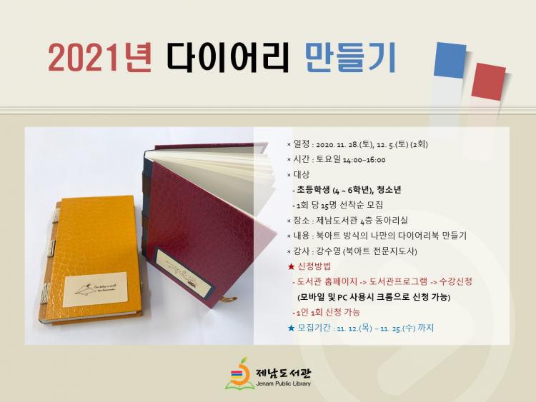 2021³â ´ÙÀ̾ ¸¸µé±â´Â ºÏ¾ÆÆ® ±â¹ýÀ» ÀÀ¿ëÇÑ ³»³âµµ ´ÙÀ̾ ¸¸µé±â¸¦ ÅëÇÏ¿© ´Ù°¡¿À´Â »õÇØ¿¡ ´ëÇÑ ±â´ë°¨À» ³ôÀ̰í, ³ª¸¸ÀÇ ÀÛǰÀ» ½Ç»ýȰ¿¡ Ȱ¿ëÇÒ ¼ö ÀÖµµ·Ï ¿î¿µÇÏ´Â ÇÁ·Î±×·¥À¸·Î, °¼ö¿µ(ºÏ¾ÆÆ® Àü¹®Áöµµ»ç) °»çÀÇ Áöµµ·Î 11¿ù 28ÀÏ(Åä)°ú 12¿ù 5ÀÏ(Åä) ¿ÀÈÄ 2½ÃºÎÅÍ 4½Ã±îÁö µÎ ¹ø ¿î¿µÇÑ´Ù.