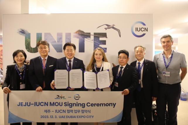 ¿À¿µÈÆ Á¦ÁÖµµÁö»ç¿Í ±×·¹ÅÚ ¾Æ±æ¶ó¸£(Grethel Aguilar) IUCN »ç¹«ÃÑÀåÀº 3ÀÏ ¿ÀÈÄ(ÇöÁö½Ã°£) Á¦28Â÷ À¯¿£±âÈĺ¯ÈÇù¾à ´ç»ç±¹ ÃÑȸ(COP28)°¡ ¿¸®°í ÀÖ´Â µÎ¹ÙÀÌ ¿¢½ºÆ÷½ÃƼ¿¡¼ Á¦ÁÖ-IUCN ¾÷¹«Çù·Â ¾çÇØ°¢¼(MOU)¸¦ ü°áÇß´Ù.