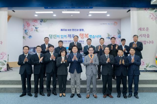 Á¦ÁÖÆ¯º°ÀÚÄ¡µµ´Â 29ÀÏ Á¦ÁÖµµÃ» ޶óȦ¿¡¼ 2023³â ÇϹݱ⠰øÁ÷ÀÚ ÅðÀÓ½Ä ¹× Á¤ºÎÆ÷»ó ¼ö¿©½ÄÀ» °³ÃÖÇß´Ù.À̳¯ ÀÌÁßȯ ÀÌ»ç°üÀ» Æ÷ÇÔÇÑ 37¸íÀÇ °øÁ÷ÀÚ°¡ ª°Ô´Â 20³â, ±æ°Ô´Â 38¿©³âÀÇ °øÁ÷»ýȰÀ» ¸¶¹«¸®ÇÏ°í ¸í¿¹·Ó°Ô ÅðÁ÷Çß´Ù. À̳¯ Çà»ç´Â ÀçÁ÷°ø¹«¿ø ȯ¼Û ÃàÇϰø¿¬À» ½ÃÀÛÀ¸·Î Á¤ºÎÆ÷»ó ¼ö¿©, ÅðÁ÷ÀÚ Ãß¾ï ¿µ»ó »ó¿µ, ¿À¿µÈÆ Á¦ÁÖµµÁö»çÀÇ °Ý·Á»ç, ÅðÁ÷ °ø¹«¿øµéÀÇ ÅðÀÓ»ç ¼øÀ¸·Î ÁøÇàµÆ´Ù.