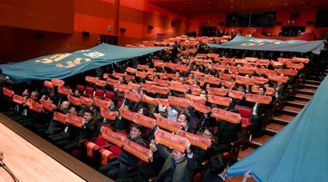 ¾Æ¿ï·¯ ¡°´©±¸µµ °É¾îº¸Áö ¾Ê¾Ò´ø ±æ¿¡ ¿ì¸®´Â ±æÀ» ³Â°í ±× ±æ¿¡ °¡Àå ¾ÕÀå¼¼ °É¾î°¡°í ÀÖ´Â ¿ì¸®ÀÇ Çຸ¸¦ Àü ¼¼°è°¡ ÁÖ¸ñÇϰí ÀÖ´Ù¡±¸é¼ ¡°°øÁ÷ÀÚ °£ ½Å·Ú¿Í Çù·ÂÀÇ ¿©°ÇÀÌ ¸¸µé¾îÁø´Ù¸é ¿ì¸®°¡ µµÀüÇÏ´Â ¾î¶°ÇÑ Àϵµ ½ÇÆÐÇÏÁö ¾ÊÀ» °ÍÀ̸ç, ¸¸¾à ½ÇÆÐÇÏ´õ¶óµµ ±×°ÍÀº ½ÇÆÐ°¡ ¾Æ´Ï¶ó ¼º°øÀ» À§ÇÑ °úÁ¤ÀÌ µÉ °Í¡±À̶ó°í ¸»Çß´Ù. ³¡À¸·Î ¡°Á¦ÁÖµµÁ¤Àº °øÁ÷ÀÚ ¿©·¯ºÐ°ú ÇÔ²² µµÀüÀÇ ±æ, Çõ½ÅÀÇ ±æÀ» ³õÁö ¾Ê°Ú´Ù¡±°í ¾à¼ÓÇß´Ù.