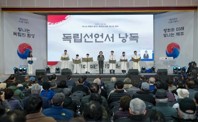 À̳¯ ±â³ä½Ä¿¡¼´Â ±¹¾Ç¿¬Èñ´Ü Çϳª¾ÆÆ®ÀÇ ½ÄÀü ÃàÇϰø¿¬ÀÎ ¡®ºû³ª´Â µ¶¸³ÀÇ ÇÔ¼º¡¯ ´ëºÏ °ø¿¬À» ½ÃÀÛÀ¸·Î Á¦ÁÖ À¯ÀÏÀÇ »ýÁ¸ ¾Ö±¹Áö»çÀÎ °Å¼± Áö»çÀÇ ÀÎÅÍºä ¿µ»ó »ó¿µ°ú °Å¼± Áö»çÀÇ ¾ÆµéÀÎ °´ë¼º ¾¾°¡ °Å¼± Áö»çÀÇ ¾÷ÀûÀ» ¼Ò°³Çß´Ù.ÀÌ¾î¼ µµ¹Î Âü¿©ÀÚ¿Í µ¶¸³À¯°øÀÚ ÈļյéÀÇ ¸±·¹ÀÌ µ¶¸³¼±¾ð¹® ³¶µ¶, 3¡¤1Àý ±â³ä¿µ»ó »ó¿µ, À¯°øÀÚ Ç¥Ã¢(¿ÂÆò¸® ÇØ³àȸ), ±â³ä»ç, Á¦ÁÖµµ¸³ÇÕâ´ÜÀÇ ±â³ä°ø¿¬, 3¡¤1Àý ³ë·¡ Á¦Ã¢, ¸¸¼¼»ïâ ¼øÀ¸·Î ÁøÇàµÆ´Ù.