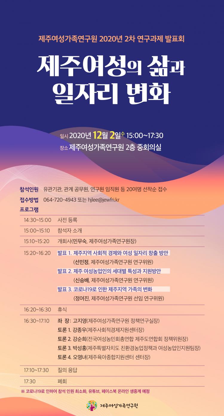 ÁÖÁ¦¹ßÇ¥´Â ¼±¹ÎÁ¤ ¿¬±¸À§¿øÀÌ¡°Á¦ÁÖÁö¿ª »çȸÀû °æÁ¦¿Í ¿©¼º ÀÏÀÚ¸® âÃâ¹æ¾È¡±, ½Å½Â¹è ¿¬±¸À§¿øÀÌ¡°Á¦ÁÖ¿©¼º³ó¾÷ÀÎÀÇ ¼¼´ëº° Ư¼º°ú Áö¿ø¹æ¾È¡±, Á¤¿©Áø ¼±ÀÓ ¿¬±¸À§¿øÀÌ¡°Äڷγª19·Î ÀÎÇÑ Á¦ÁÖÁö¿ª °¡Á·ÀÇ º¯È¡±¶ó´Â ÁÖÁ¦·Î °¢°¢ ¹ßÇ¥¸¦ ÇÒ ¿¹Á¤ÀÌ´Ù.