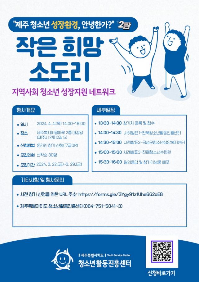 [Á¦ÁÖµµ¹Î½Å¹® = ¿À½ÂÅà ±âÀÚ] Á¦ÁÖÆ¯º°ÀÚÄ¡µµÃ»¼Ò³âȰµ¿ÁøÈï¼¾ÅÍ(¼¾ÅÍÀå °­¿Á·Ã)´Â ¿À´Â 4¿ù 4ÀÏ Á¦ÁÖÆ¯º°ÀÚÄ¡µµº¹ÁöÀÌÀ½¸¶·ç¿¡¼­ µµ³» û¼Ò³â Ȱµ¿, º¹Áö, º¸È£ ÇöÀåÁ¾»çÀÚµé°ú '2024 ÀÛÀº Èñ¸Á ¼Òµµ¸®'¸¦ °³ÃÖÇÑ´Ù.