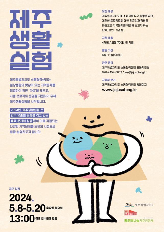 ¸ðÁý ´ë»óÀº Á¦ÁÖÆ¯º°ÀÚÄ¡µµ ¼ÒÀ縦 µÎ°í Ȱµ¿Çϸç, Á¦¾ÈÇÑ ÇÁ·ÎÁ§Æ®¿¡ ´ëÇÑ Àü¹®¼º°ú °æÇèÀ» ¹ÙÅÁÀ¸·Î Áö¿ª¹®Á¦¸¦ ÇØ°áÇØ º¸°íÀÚ ÇÏ´Â ´Üü, ¹ýÀÎ, ±â¾÷ µîÀÌ´Ù. ÃÑ 4°³ÆÀ ³»¿Ü¸¦ ¼±Á¤ÇÒ ¿¹Á¤À̸ç, ¼ÒÅëÇù·Â¼¾ÅÍ È¨ÆäÀÌÁö (www.jejusotong.kr)¸¦ ÅëÇØ ½ÅûÇÒ ¼ö ÀÖ´Ù.