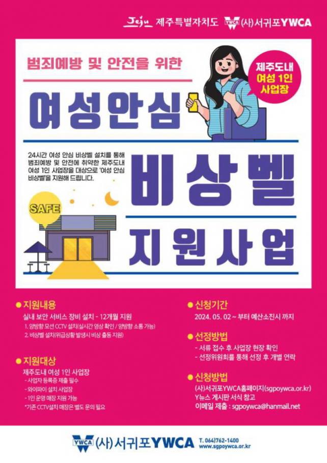 Áö¿ø ¹°Ç°Àº ¾ç¹æÇâ ¸ð¼Ç CCTV(½Ç½Ã°£ ¿µ»ó È®ÀÎ, ¾ç¹æÇâ ¼ÒÅë °¡´É)¿Í ºñ»óº§(À§±Þ»óȲ ½Ã ÇöÀåÃ⵿)ÀÌ´Ù. ¿©¼º¾È½É ºñ»óº§ ¼³Ä¡¸¦ ¿øÇÏ´Â ¿©¼º 1ÀÎ »ç¾÷ÀåÀº ¼±ÍÆ÷ YWCA·Î ½Åû¼¸¦ Á¦ÃâÇÏ¸é µÈ´Ù.