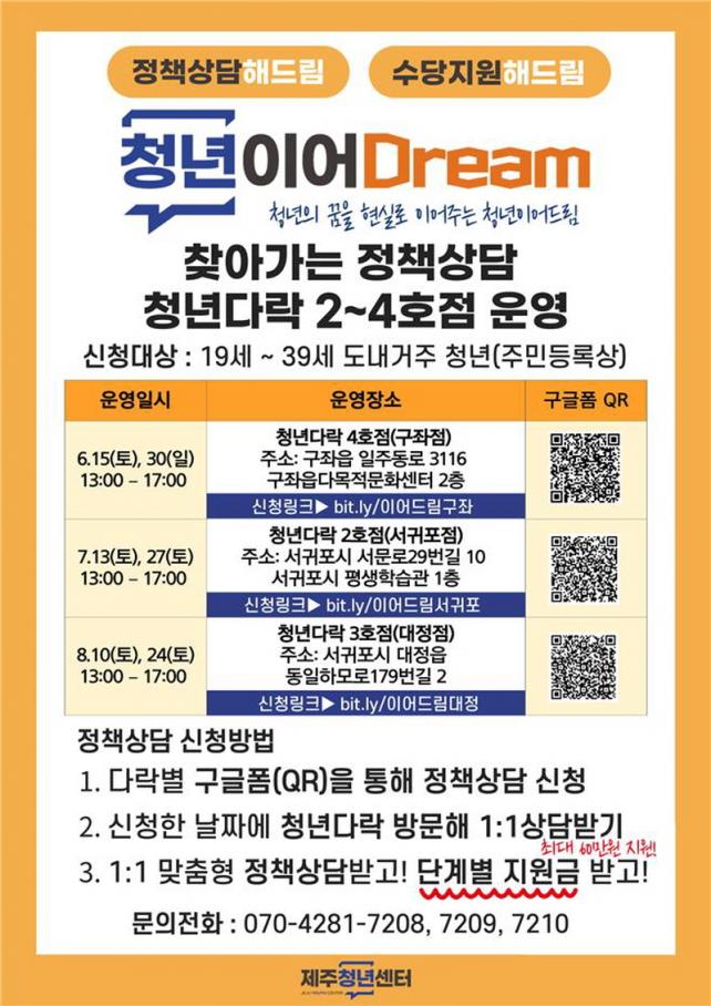 ¶ÇÇÑ, 3´Ü°è Çǵå¹é »ó´ã¿¡¼ Á¦ÁÖû³â¼¾ÅÍ º»Á¡ ¹æ¹®ÀÌ ¾î·Æ´Ù´Â û³âµé°ú ÁÖ¸» ½Ã°£´ë »ó´ã °³¼³À» Èñ¸ÁÇϴ û³âµéÀÇ ÀǰßÀ» ¼ö·ÅÇØ 6¿ùºÎÅÍ 8¿ù±îÁö ¼øÂ÷ÀûÀ¸·Î ¡®Ã£¾Æ°¡´Â Á¤Ã¥»ó´ã¡¯À» û³â´Ù¶ô ±¸ÁÂÁ¡(4È£Á¡), û³â´Ù¶ô ¼±ÍÆ÷Á¡(2È£Á¡), û³â´Ù¶ô ´ëÁ¤Á¡(3È£Á¡)¿¡¼ Åä¿äÀϰú ÀÏ¿äÀÏ¿¡ ¿î¿µÇÒ °èȹÀÌ´Ù. ȸÂ÷º° 20¸í±îÁö ½ÅûÀÌ °¡´ÉÇϸç, ȸÂ÷º° ½Åû¸µÅ©¿Í Æ÷½ºÅÍÀÇ QRÄڵ带 ÅëÇØ »çÀü½ÅûÀ» ÇÒ ¼ö ÀÖ´Ù. ¡®Ã»³âÀ̾îµå¸²¡¯Àº »ý¾Ö Áֱ⺰ û³âº¸ÀåÁ¦ÀÇ ÇÙ½ÉÀΠû³âÁ¤Ã¥ ¸ÂÃãÇü Àü´Þ ü°è·Î û³â Á¤Ã¥À» ¾ËÁö ¸øÇØ ÇýÅÃÀ» ¸ø ¹Þ´Â û³âÀÌ ¾øµµ·Ï Á¤Ã¥»ó´ãÀ» Á¦°øÇÏ°í ´Ü°èº° Áö¿ø±ÝÀ» Á¦°øÇÑ´Ù. »ó´ã¸¸ ¹Þ¾Æµµ ¹ÌÃë¾÷ û³âÀº 10¸¸¿ø, Ãë¾÷ û³âÀº 5¸¸¿øÀ» Áö±ÞÇÑ´Ù.
