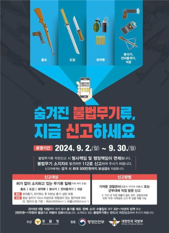 ºÒ¹ý¹«±â·ù ÀÚÁø½Å°í ´ë»óÀº Çã°¡ ¾øÀÌ ¼ÒÁöÇϰí Àְųª ¼ÒÁö Çã°¡°¡ Ãë¼ÒµÈ Ãѱâ, Ⱦà·ù(Ⱦà‧Æø¾à‧½Çź‧Æ÷ź µî), µµ°Ë, ºÐ»ç±â, ÀüÀÚÃæ°Ý±â, ¼®±Ã µî ºÒ¹ý¹«±â·ù ÀÏüÀÌ´Ù.