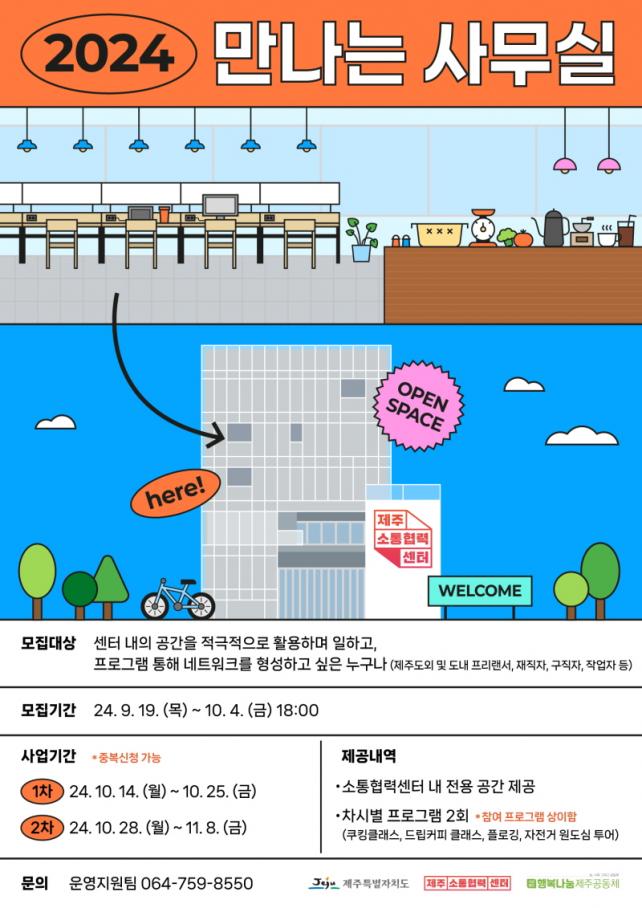 <2024 ¸¸³ª´Â »ç¹«½Ç>Àº ÃÑ 2ȸÂ÷¿¡ °ÉÃÄ ¿î¿µµÇ¸ç, 1Â÷´Â 10¿ù 14ÀϺÎÅÍ 10¿ù 25ÀϱîÁö, 2Â÷´Â 10¿ù 28ÀϺÎÅÍ 11¿ù 4ÀϱîÁö °¢ 2ÁÖ°£ ÁøÇàµÈ´Ù. °¢ ȸÂ÷º°·Î 15¸í À̳»ÀÇ Âü°¡ÀÚ¸¦ 9¿ù 19ÀϺÎÅÍ 10¿ù 4ÀϱîÁö Á¦ÁÖÆ¯º°ÀÚÄ¡µµ ¼ÒÅëÇù·Â¼¾ÅÍ È¨ÆäÀÌÁö(jejusotong.kr)¸¦ ÅëÇØ ¼±Âø¼øÀ¸·Î ¸ðÁýÇÑ´Ù.