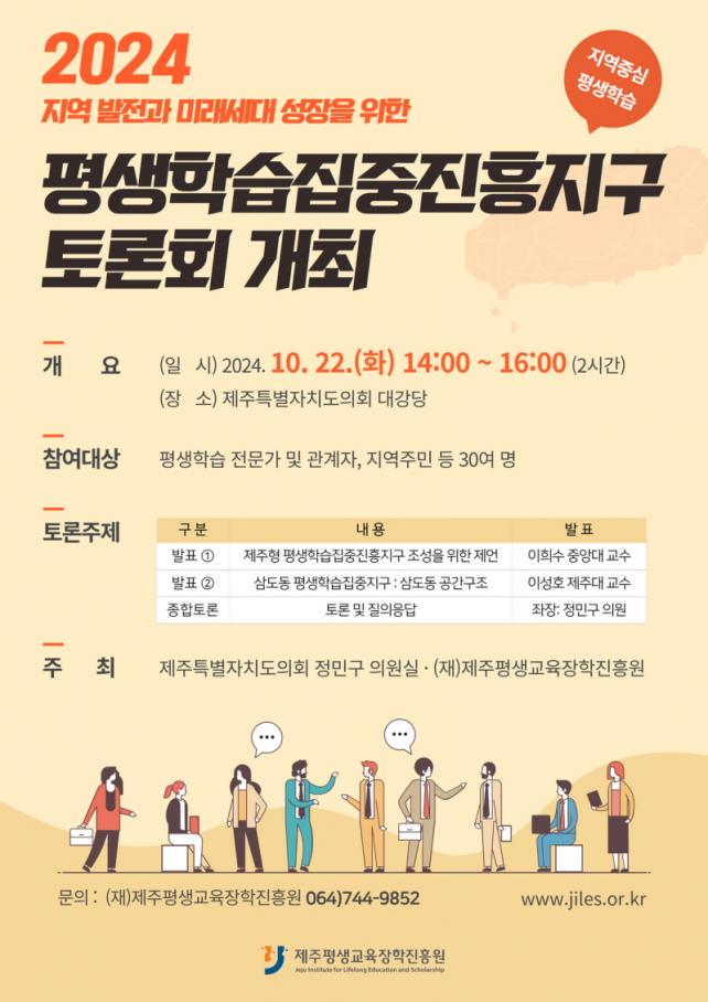 Á¦ÁÖÆ¯º°ÀÚÄ¡µµÀÇȸ Á¤¹Î±¸ ÀÇ¿ø°ú Á¦ÁÖÆò»ý±³À°ÀåÇÐÁøÈï¿øÀÌ °øµ¿ ÁÖ°üÇÑ À̹ø Çà»ç´Â µµ³»¡¤¿Ü Æò»ýÇнÀ Àü¹®°¡ ¹× °ü°èÀÚ, Áö¿ªÁֹΠµî 30¿© ¸íÀÌ ¸ð¿© Á¦ÁÖÇü Æò»ýÇнÀÁýÁßÁøÈïÁö±¸ Á¶¼ºÀ» À§ÇÑ ÁÖÁ¦ ¹ßÇ¥¸¦ ÁøÇàÇϰí, Á¾ÇÕÅä·Ð µîÀ» ÅëÇØ ´ëÀÀ ¹æÇâ°ú °úÁ¦¸¦ ¸ð»öÇÒ ¿¹Á¤ÀÌ´Ù.