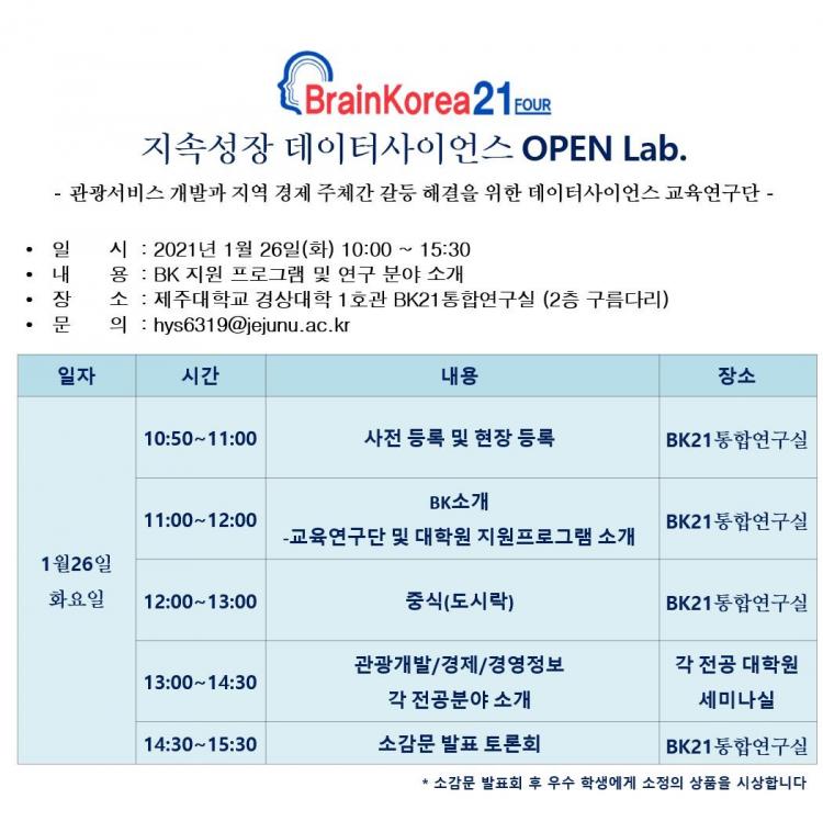 Á¦ÁÖ´ëÇб³ BK(Brain Korea)21 Áö¼Ó¼ºÀå µ¥ÀÌÅÍ»çÀ̾𽺠±³À°¿¬±¸´Ü(´ÜÀå ±è¹Îö ±³¼ö, ÀÌÇÏ ¿¬±¸´Ü)Àº ¿À´Â 26ÀÏ ÇкλýµéÀ» ´ë»óÀ¸·Î BK»ç¾÷°ú °ü·ÃÇØ ¿¬±¸½ÇÀ» ¼Ò°³ÇÏ°í ±³À°Æ®·¢ ¹× Áö¿ø ÇÁ·Î±×·¥ µîÀ» ¼Ò°³ÇÏ´Â OPEN LabÀ» ÁøÇàÇÒ ¿¹Á¤À̶ó°í 15ÀÏ ¹àÇû´Ù.
