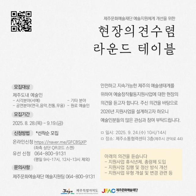 Âü¿© ½ÅûÀº µµ³» ¿¹¼úÀÎÀ» ´ë»óÀ¸·Î ¼±Âø¼ø Á¢¼öµÇ¸ç, ¸ðÁý Æ÷½ºÅÍ¿¡ °ÔÀçµÈ QRÄÚµå(naver.me/GFCBSjXP)¶Ç´Â À¯¼±(064-800-9131)À¸·Î Á¢¼öÇÒ ¼ö ÀÖ´Ù.