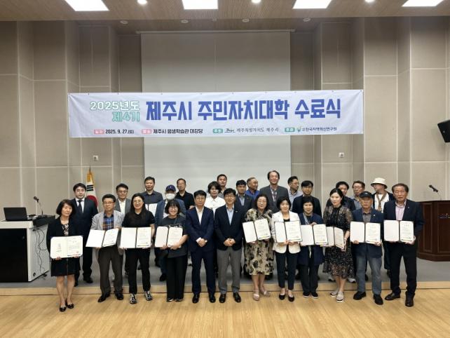 À̳¯ ¼ö·á½Ä¿¡¼´Â Áö³ 6¿ùºÎÅÍ 9¿ù±îÁö 4°³¿ù°£ ÁÖ¹ÎÀÚÄ¡´ëÇп¡¼ ¡ã±âº»¼Ò¾ç(Áö¿ª¹®Á¦ °¥µî°ü¸® ¹× ÇØ°á°úÁ¤¤ýÁ¦ÁÖ ÀÌÇØ¸¦ À§ÇÑ ¹Ì¼ú°ü ¼Ó ¼¼°è¿©Çà), ¡ãÁö¹æÀÚÄ¡(Á¦ÁÖÀÇ Áö¼Ó°¡´É¹ßÀü ¸ñÇ¥¤ýÁÖ¹ÎÀÚġȸ µµÀÔ°ú ÁÖ¹ÎÀÚÄ¡ ¿ì¼ö»ç·Ê µî), ¡ã½Ç¹«¿ª·®(Chat GPT ÀÌÇØ¿Í ÁÖ¹ÎÀÚÄ¡ Ȱ¿ë¤ýÁÖ¹ÎÀÚÄ¡ ÆÛ½Ç¸®µ¥ÀÌÅÍ ±³À° µî), ¡ã¿öÅ©¼ó µîÀÇ ±³À°À» À̼öÇÑ 33¸í¿¡°Ô ¼ö·áÁõÀÌ Àü´ÞµÆ´Ù.
