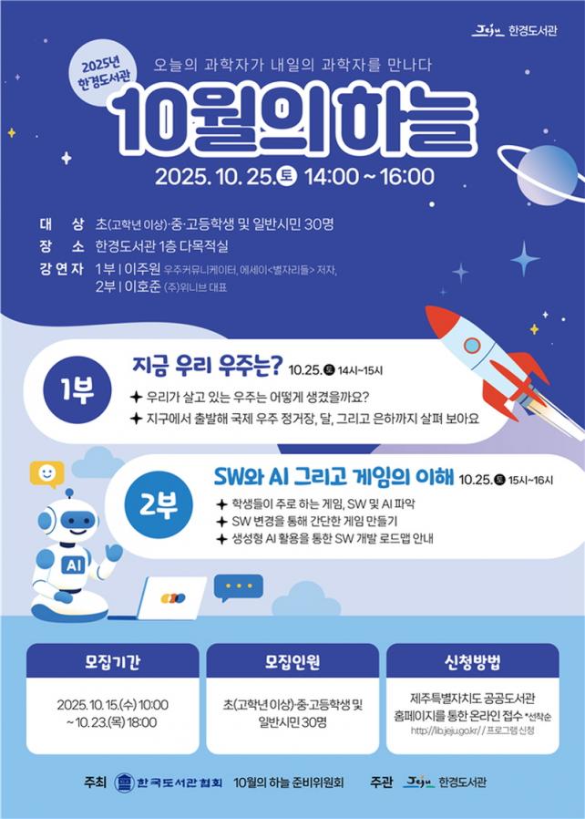[Á¦ÁÖµµ¹Î½Å¹® = ¿À½ÂÅà ±âÀÚ] ÇѰ浵¼­°üÀº Çѱ¹µµ¼­°üÇùȸ¿Í 10¿ùÀÇ ÇÏ´Ã ÁغñÀ§¿øÈ¸°¡ °øµ¿ ÁÖÃÖÇÏ´Â ¡®10¿ùÀÇ ÇÏ´Ã: °úÇÐÀÚµéÀÇ Àç´É±âºÎ µµ¼­°ü °úÇÐ °­¿¬¡¯ °ø¸ð¿¡ ¼±Á¤µÅ ¿À´Â 10¿ù 25ÀÏ(Åä) ´Ù¸ñÀû½Ç¿¡¼­ °­¿¬À» °³ÃÖÇÑ´Ù.