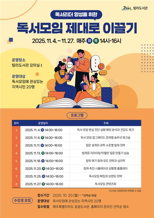 ÇÁ·Î±×·¥ Âü¿©¸¦ ¿øÇÏ´Â ½Ã¹ÎÀº 10¿ù 20ÀϺÎÅÍ Á¦ÁÖÆ¯º°ÀÚÄ¡µµ °ø°øµµ¼°ü ´©¸®Áý(https://www.jeju.go.kr/lib)¢¡Çà»ç/ÇÁ·Î±×·¥¢¡µµ¼°ü ÇÁ·Î±×·¥½ÅûÀ» ÅëÇØ Á¢¼öÇÒ ¼ö ÀÖÀ¸¸ç, ±âŸ ÀÚ¼¼ÇÑ »çÇ×Àº ޶󵵼°ü(¢Ï064-728-8373)À¸·Î ¹®ÀÇÇÏ¸é µÈ´Ù.