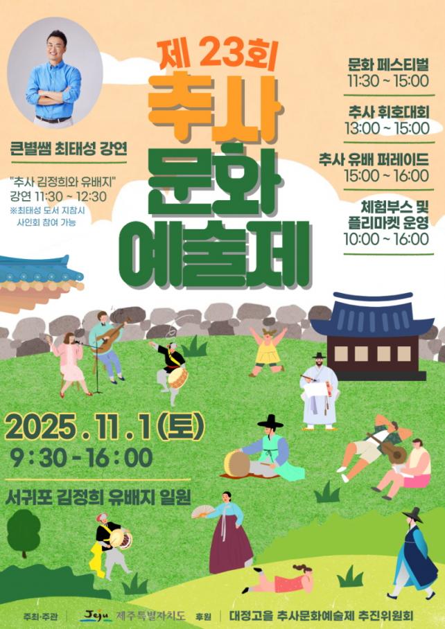 ¿ÃÇØ Ã߻繮ȭÁ¦´Â ¡®¼¼Çѵµ, Á¦ÁÖ¿¡¼­ ÇǾ Ãß»çÀÇ ¿¹¼úÈ¥¡¯À» ÁÖÁ¦·Î, Ãß»ç ±èÁ¤Èñ ¼±»ýÀÌ Á¦ÁÖ À¯¹è±â°£ µ¿¾È ²ÉÇÇ¿î ¿¹¼úÁ¤½ÅÀ» µÇ»õ±ä´Ù. ¹®È­¡¤Ã¼Ç衤°ø¿¬․°æ¿¬ µî 4°³ ºÎ¹® 14°³ ÇÁ·Î±×·¥À¸·Î ±¸¼ºµÇ¸ç ¸ðµÎ ¹«·á·Î Âü¿©ÇÒ ¼ö ÀÖ´Ù.