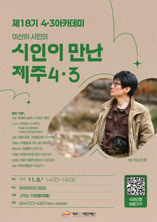 µÎ ÀÛ°¡´Â À̳¯ ´ë´ãÀ» ÅëÇØ °¢ÀÚÀÇ ÀÛǰ ¼¼°è¿Í 4‧3À» ¹Ù¶óº¸´Â ½Ã°¢, ±×¸®°í ¹®ÇÐÀÌ ±â¾ïÀÇ Àü´ÞÀڷμ Áö´Ñ ¿ªÇÒ¿¡ ´ëÇØ ±íÀÌ ÀÖ´Â À̾߱⸦ ³ª´ ¿¹Á¤ÀÌ´Ù. À̾î 11¿ù 8ÀÏ(Åä) ¿ÀÈÄ 2½ÃºÎÅÍ 4½Ã±îÁö´Â °°Àº Àå¼ÒÀÎ Á¦ÁÖ¹®Çаü ´ë°´ç¿¡¼ ½ÃÀÎ ÀÌ»êÇϰ¡ Âü¿©ÇÏ´Â µÎ ¹øÂ° ÇÁ·Î±×·¥ <½ÃÀÎÀÌ ¸¸³ Á¦ÁÖ4‧3>ÀÌ ¿¸°´Ù.