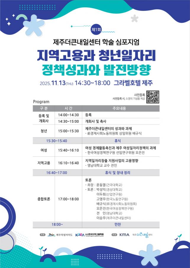 À̹ø ½ÉÆ÷Áö¾öÀº Á¦ÁÖÆ¯º°ÀÚÄ¡µµ¿Í Çѱ¹Áö¿ª°í¿ëÇÐȸ°¡ °øµ¿ ÁÖÃÖÇϰí, Á¦ÁÖ´õÅ«³»Àϼ¾ÅͰ¡ ÁÖ°üÇÏ´Â Çà»ç·Î, ¡®Áö¿ª°í¿ë°ú û³â ÀÏÀÚ¸® Á¤Ã¥¼º°ú¿Í ¹ßÀü¹æÇ⡯À» ÁÖÁ¦·Î ¿­¸°´Ù. Àü±¹ÀÇ Áö¿ª°í¿ëÁ¤Ã¥ Àü¹®°¡¿Í ½Ç¹«ÀÚµéÀÌ ÇÑÀÚ¸®¿¡ ¸ð¿© ´Ù¾çÇÑ Á¤Ã¥ »ç·Ê¸¦ °øÀ¯Çϰí, ÇâÈÄ Áö¿ª ÀÏÀÚ¸® Á¤Ã¥ÀÇ ¹ßÀü ¹æÇâÀ» ³íÀÇÇÒ ¿¹Á¤ÀÌ´Ù.