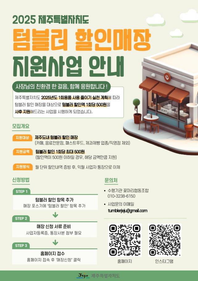 ÅÒºí·¯ ÇÒÀÎ ¸ÅÀå Áö¿ø»ç¾÷Àº ÅÒºí·¯¸¦ ÀÌ¿ëÇÏ´Â °í°´¿¡°Ô ÀÏÁ¤ ±Ý¾×À» ÇÒÀÎÇÏ´Â ¸ÅÀå¿¡ 1ÄÅ´ç ÃÖ´ë 500¿ø±îÁö Áö¿øÇÏ´Â »ç¾÷ÀÌ´Ù. ÇöÀç 79°³ ¸ÅÀåÀÌ Âü¿© ÁßÀ̸ç, Àü¿ë ´©¸®Áý(http://store.tumblerjeju.com)À» ÅëÇØ ½ÅûÇÒ ¼ö ÀÖ´Ù.