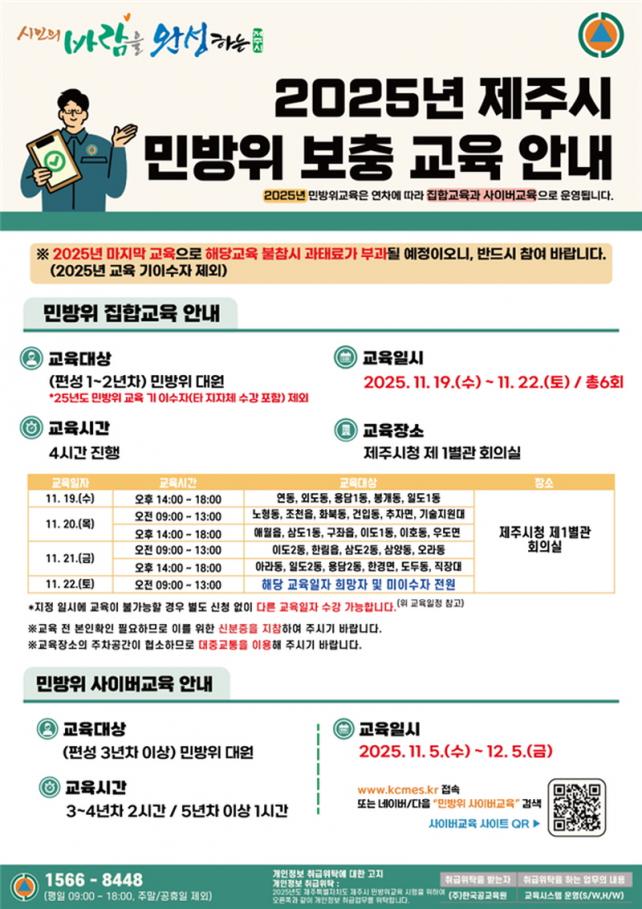 ÁýÇÕ±³À°Àº 11¿ù 19ÀÏ(¼ö)ºÎÅÍ 22ÀÏ(Åä)±îÁö Á¦ÁÖ½Ãû 1º°°ü ȸÀǽǿ¡¼ ½Ç½ÃµÉ ¿¹Á¤À̸ç, »çÀ̹ö±³À°Àº ¡®¹Î¹æÀ§ »çÀ̹ö±³À° ¼¾ÅÍ¡¯ (www.kcmes.kr)¸¦ ÅëÇØ 12¿ù 5ÀÏ(±Ý)±îÁö ¼ö°ÇÏ¸é µÈ´Ù.