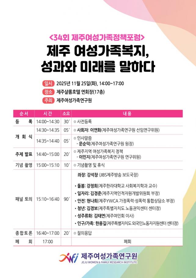 À̹ø Æ÷·³Àº ±×°£ Á¦ÁÖÁö¿ª ¿©¼º°¡Á·º¹Áö ºÐ¾ß¿¡¼ ÃßÁøµÈ Á¤Ã¥ ¼º°ú¸¦ °øÀ¯Çϰí, ÇâÈÄ ¹ßÀü ¹æÇâÀ» ¸ð»öÇϱâ À§ÇØ ¸¶·ÃµÈ ÀÚ¸®´Ù. ÁÖÁ¦ ¹ßÇ¥´Â À̹ÎÁö Á¦ÁÖ¿©¼º°¡Á·¿¬±¸¿ø ¿¬±¸À§¿øÀÌ ¡®Á¦ÁÖÁö¿ª ¿©¼º°¡Á·º¹Áö Á¤Ã¥¡¯À» ÁÖÁ¦·Î Á¦ÁÖÁö¿ª ¿©¼º°¡Á·º¹Áö Á¤Ã¥ÀÇ ÃßÁø °³¿ä¸¦ ¼Ò°³ÇÒ ¿¹Á¤ÀÌ´Ù.