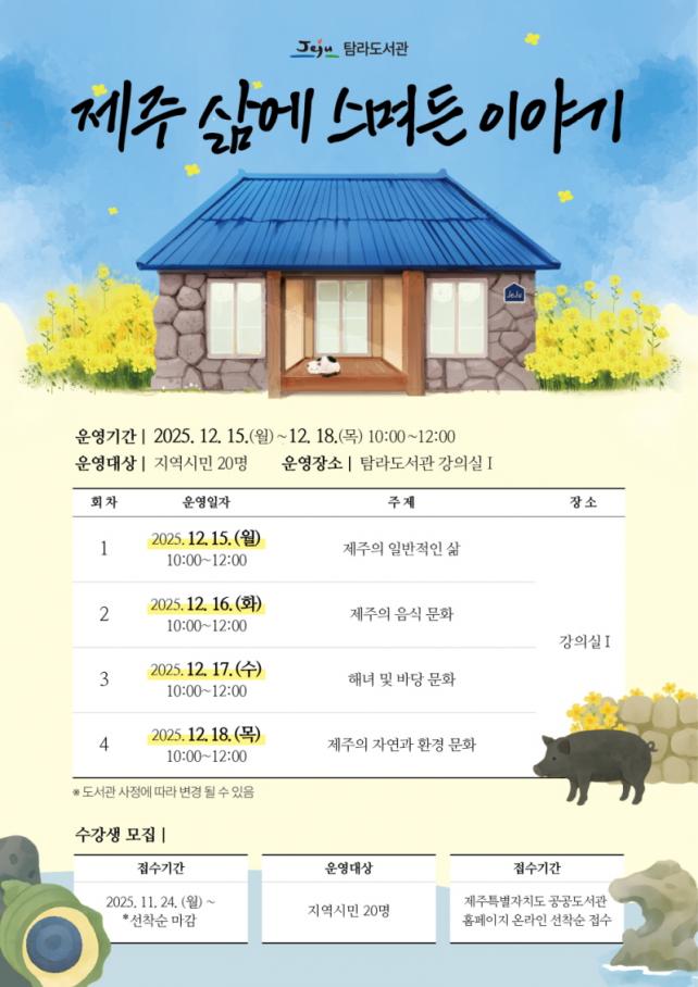 ÇÁ·Î±×·¥ Âü¿©¸¦ Èñ¸ÁÇÏ´Â ½Ã¹ÎÀº 11¿ù 24ÀϺÎÅÍ Á¦ÁÖÆ¯º°ÀÚÄ¡µµ °ø°øµµ¼­°ü ´©¸®Áý(https://www.jeju.go.kr/lib)¢¡ Çà»ç/ÇÁ·Î±×·¥¢¡ µµ¼­°ü ÇÁ·Î±×·¥ ½ÅûÀ» ÅëÇØ Á¢¼öÇÒ ¼ö ÀÖ´Ù. ±âŸ ÀÚ¼¼ÇÑ »çÇ×Àº ޶󵵼­°ü(¢Ï064-728-8373)À¸·Î ¹®ÀÇÇÏ¸é ¾È³»¹ÞÀ» ¼ö ÀÖ´Ù.